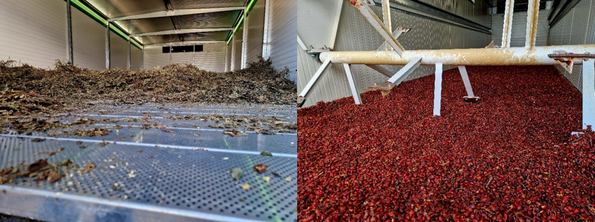 A gyógynövények betakarítás utáni egyenletes szárítása kiemelt jelentőségű, hogy megakadályozzuk az erjedést és kiváló minőségű száraz alapanyagot kapjunk a további feldolgozáshoz. A cég fejlesztései között többféle szárító konténer is található, amelyeknek perforált padozatán vagy padlóján keresztül történik a szárítás. A szárítók fűtése történhet gázzal, olajjal vagy biomasszával. A bemutatón egy fix és egy mozgópadlós perforált padlójú (2. kép), teljesen automatizált szárítókonténert tekinthettünk meg. A szárítást keverőlapátok, a szárítandó termény felhordását szalag segíti. A szárítókonténerek nagyobb volumenű szárított alapanyagok esetén függőleges állású keverőcsigákkal is felszerelhetőek.