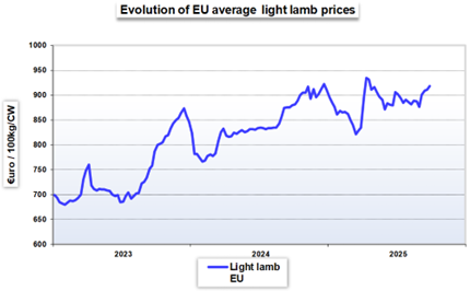 A nehéz bárány átlagára az EU-ban a 2025. október 5-vel végződő 40. héten 855,4 euró/100 kg vt. (vt. = vágott testtömeg), a könnyű bárány átlagára pedig 918,3 euró/100 kg vt. volt. A nehéz bárányár esetében -0,1%-os csökkenés, a könnyű bárányár esetében pedig 0,8%-os emelkedés volt tapasztalható az egy héttel korábban rögzített értékekhez képest (39. heti árak: nehéz bárány átlagár 856,2 euró/100 kg vt., könnyű bárány átlag 910,7 euró/100 kg vt.).