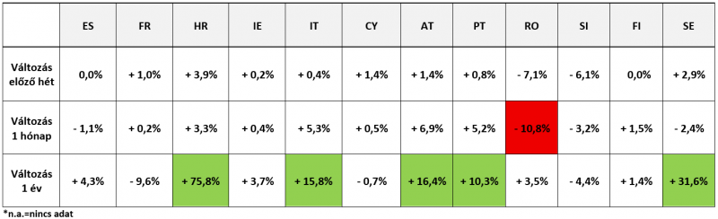 A 41. héten a könnyű bárány ár Portugáliában nem változott, Romániára vonatkozóan pedig adat nem áll rendelkezésre.