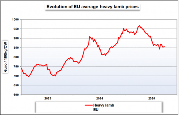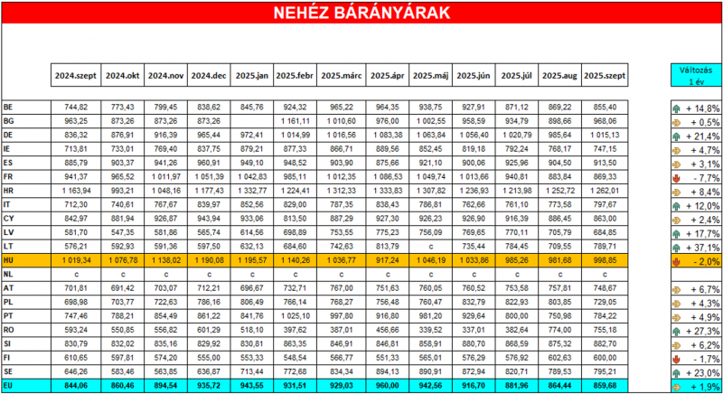 Az Európai Unióban a nehéz bárányárak átlagos értéke 2025 szeptemberében 859,68 euró/100 kg vt. volt. (Magyarország tekintetében ez az érték pedig 998,85 euró/100 kg vt. volt.)