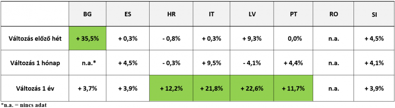 A könnyű bárány árak tekintetében a 41. héten Bulgáriában jelentős, 35,5%-os, Lettországban 9,3%-os, Szlovéniában 4,5%-os, Spanyolországban és Olaszországban 0,3%-os emelkedés, Horvátországban pedig -0,8%-os csökkenés volt tapasztalható az előző heti árakhoz képest.