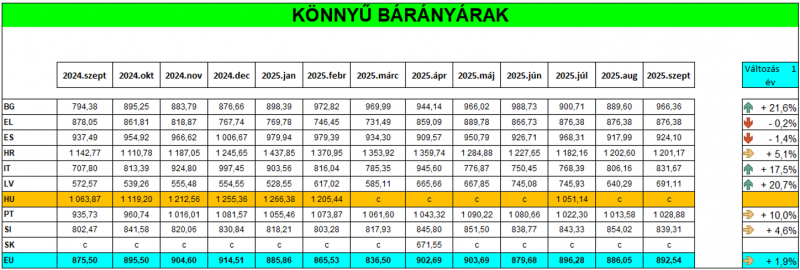 Az Európai Unióban a könnyű bárányárak átlagos értéke 2025 szeptemberében 892,54 euró/100 kg vt. volt. (Magyarországra vonatkozóan adat nem áll rendelkezésre.)