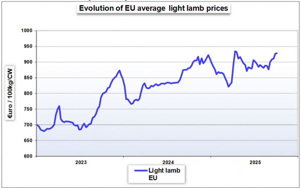 A nehéz bárány átlagára az EU-ban a 2025. október 12-vel végződő 41. héten 855,6 euró/100 kg vt. (vt. = vágott testtömeg), a könnyű bárány átlagára pedig 928,1 euró/100 kg vt. volt. A nehéz bárányár esetében 0,1%-os, a könnyű bárányár esetében pedig 0,2%-os emelkedés volt tapasztalható az egy héttel korábban rögzített értékekhez képest (40. heti árak: nehéz bárány átlagár 855,4 euró/100 kg vt., könnyű bárány átlag 918,3 euró/100 kg vt.).